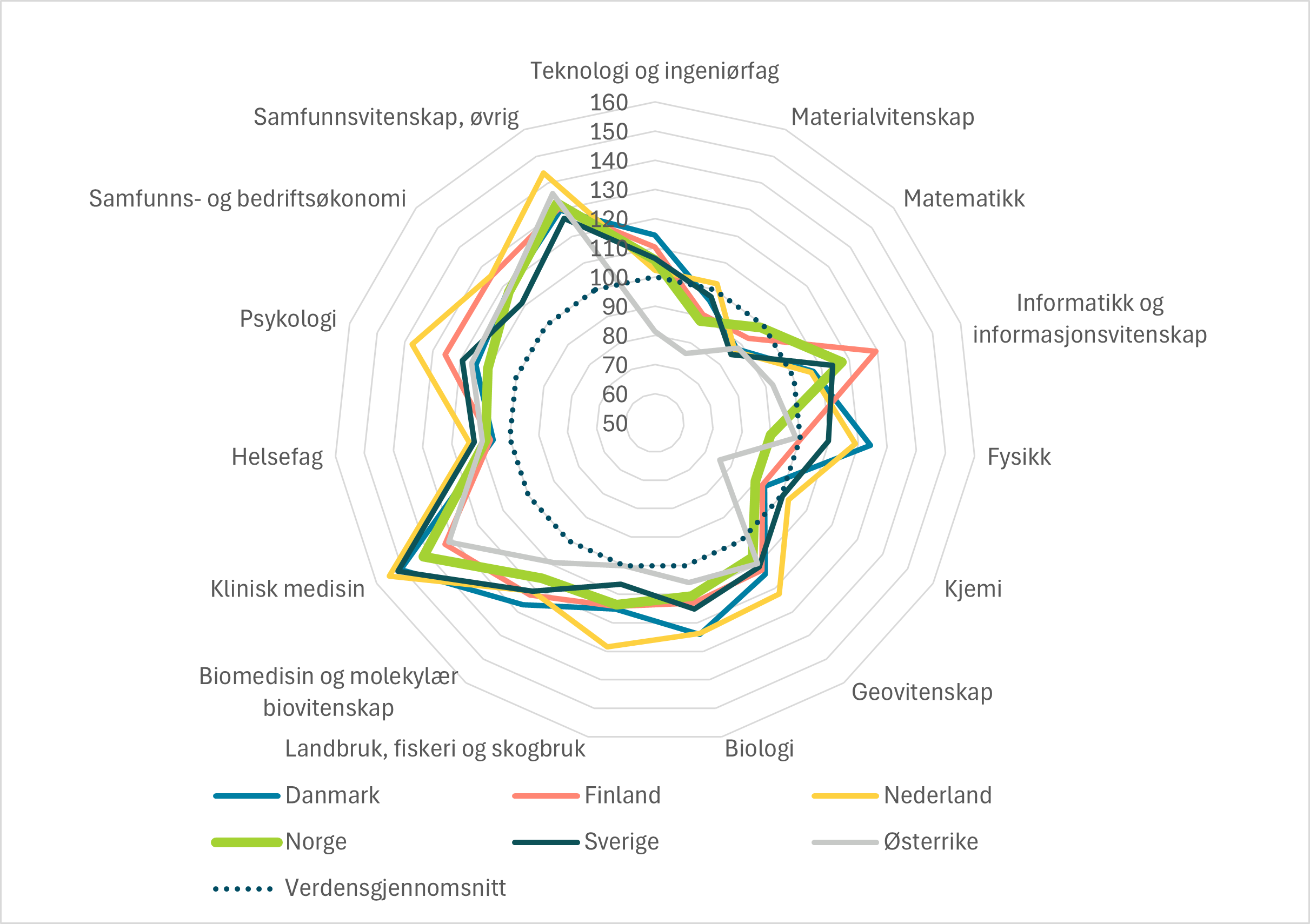 Når det gjelder Norge, finner vi en sterk spesialisering i geovitenskap, til forskjell fra barometerlandene som ligger rundt verdensgjennomsnittet her. Også i biologi har Norge en spesialisering som er langt sterkere enn i barometerlandene (selv om de alle har en spesialisering over verdensgjennomsnittet). Det er biologi og psykologi som har de sterkeste relative spesialiseringsindeksene.